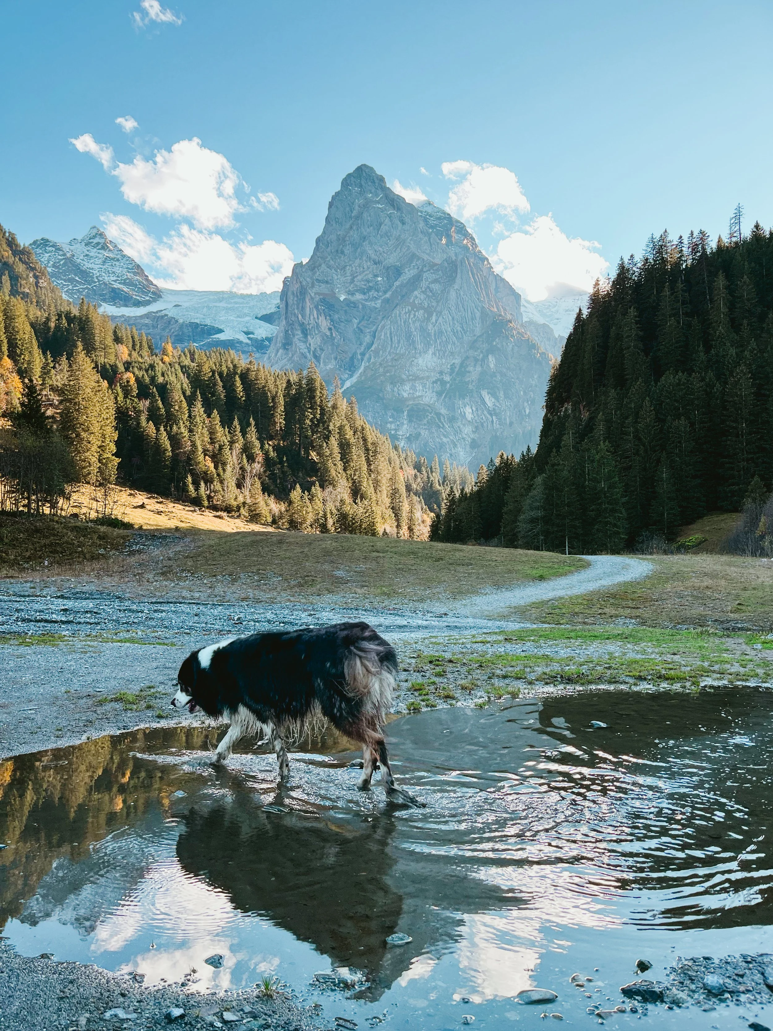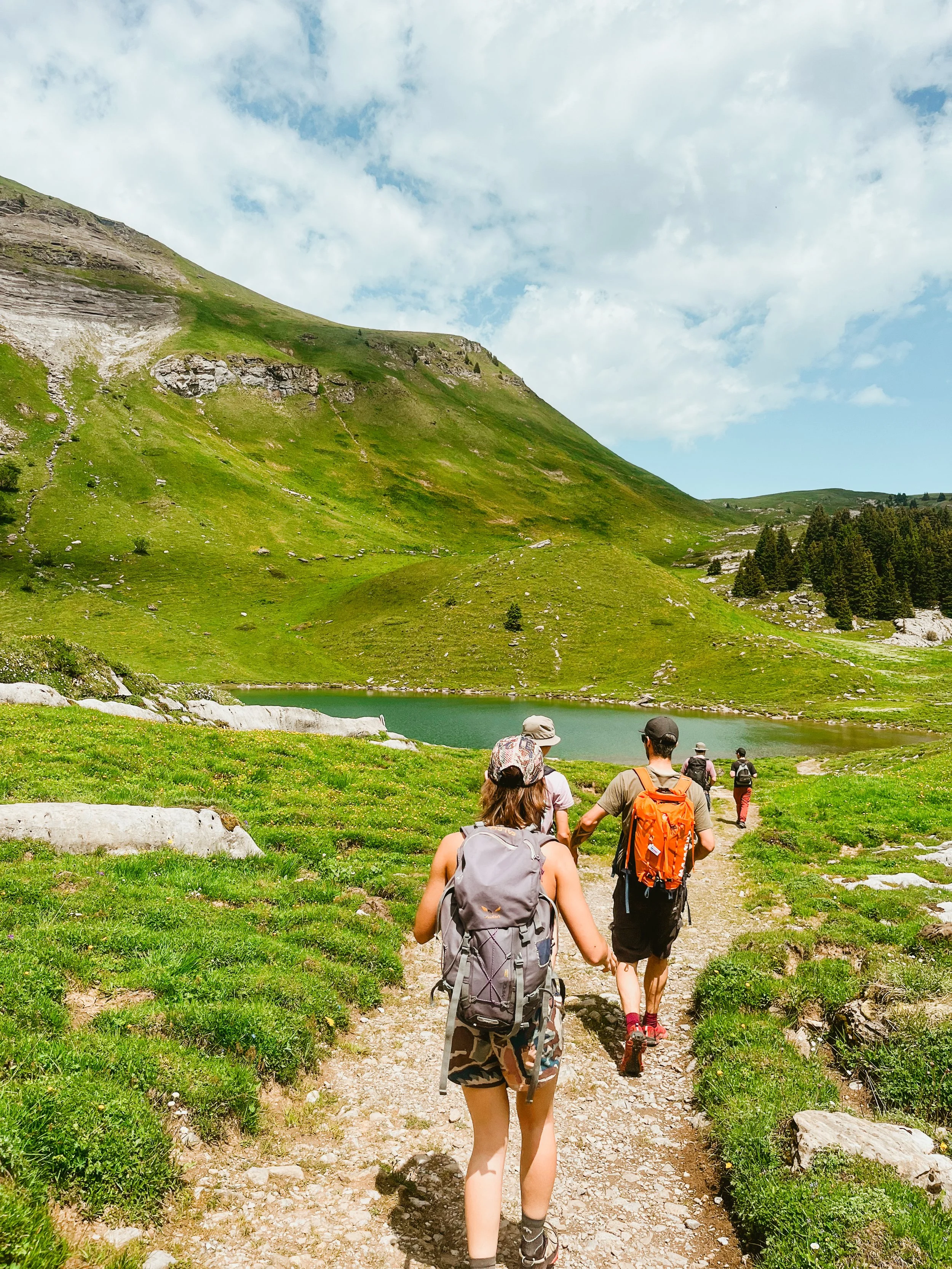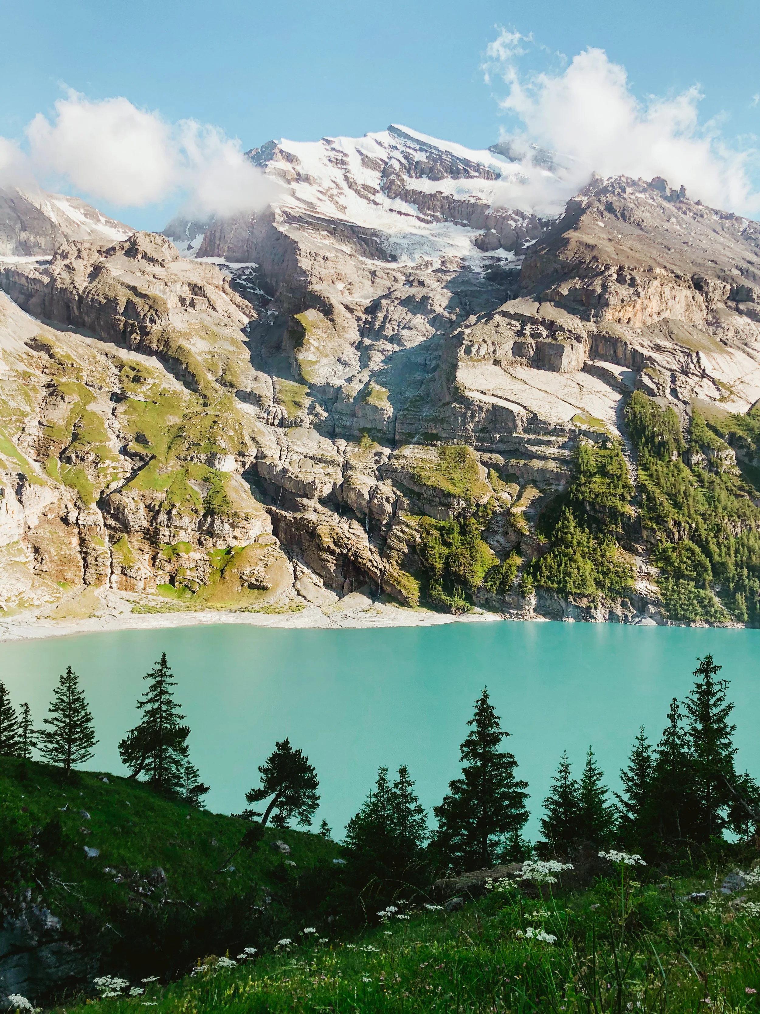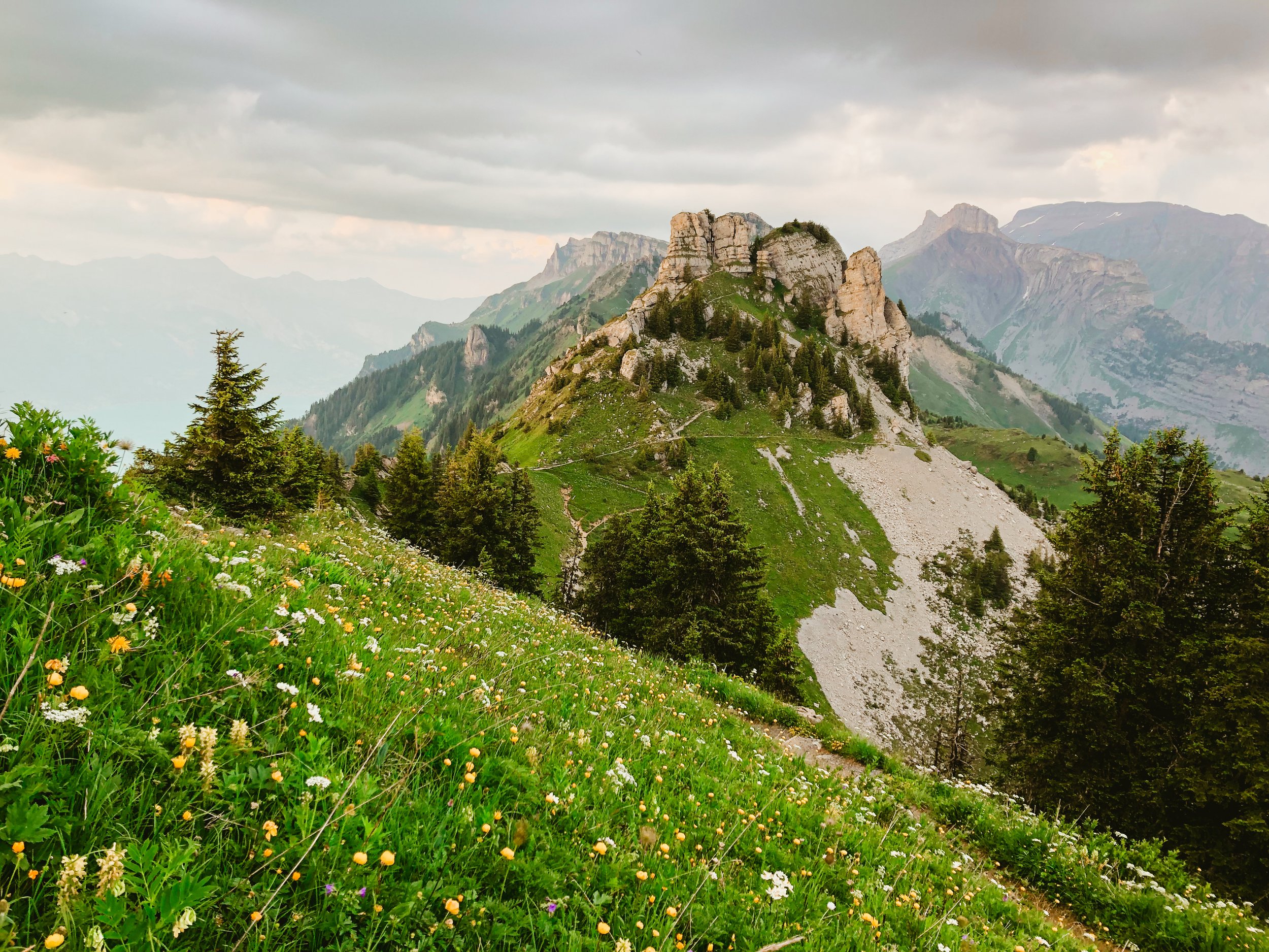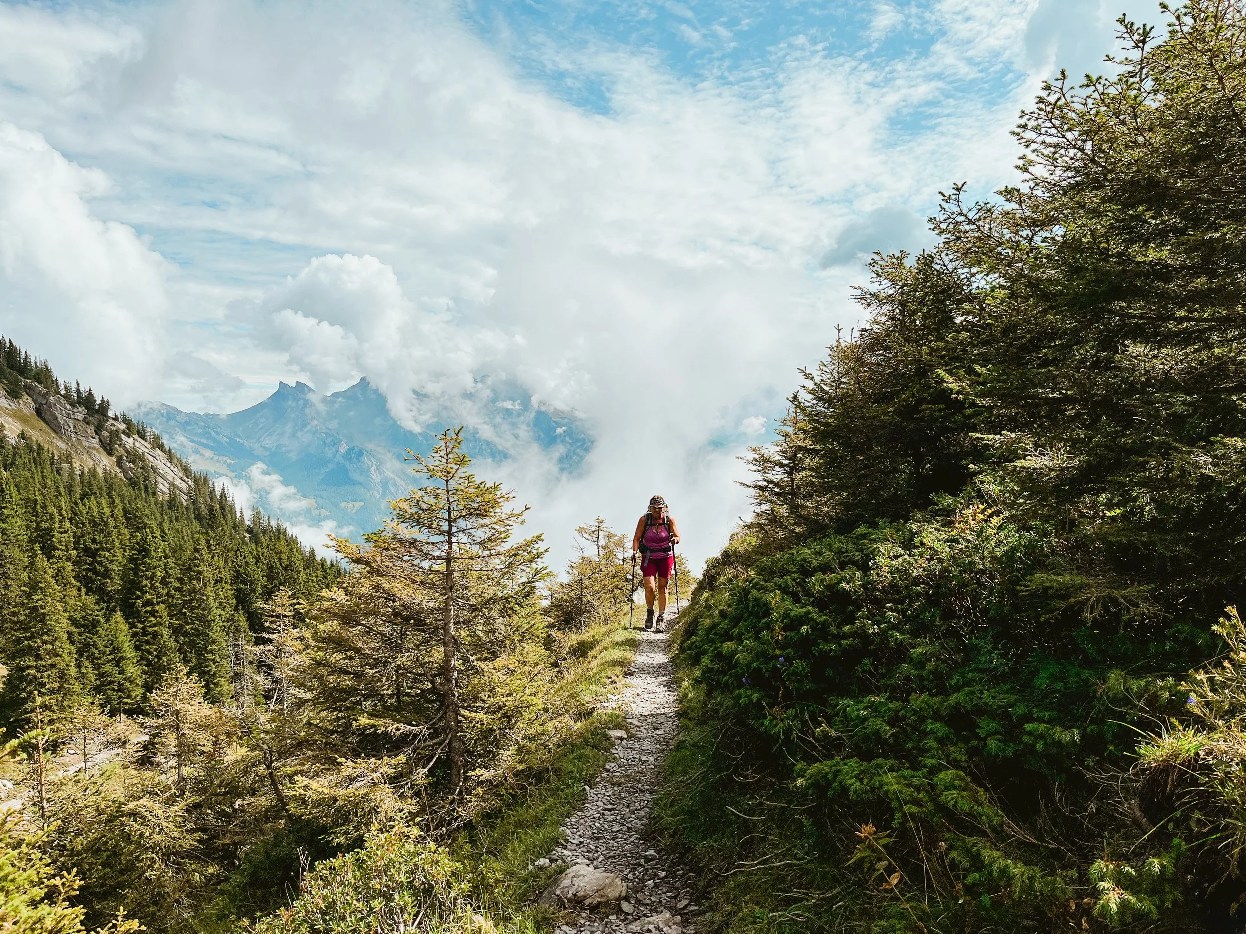 We begin at Grütschalp and head into the peaceful, forgotten-feeling Soustal valley. From there, we climb gently through wildflower pastures and traverse above the valley to reach the cozy Löbhornhütte perfect for a break, a slice of cake, or even a refreshing swim. The journey continues over Bällehöchst, before descending into the sleepy, storybook village of Saxeten. This trail has it all, views of the big peaks, flower-filled fields, peaceful forests, cows, and a rare sense of solitude and flow.