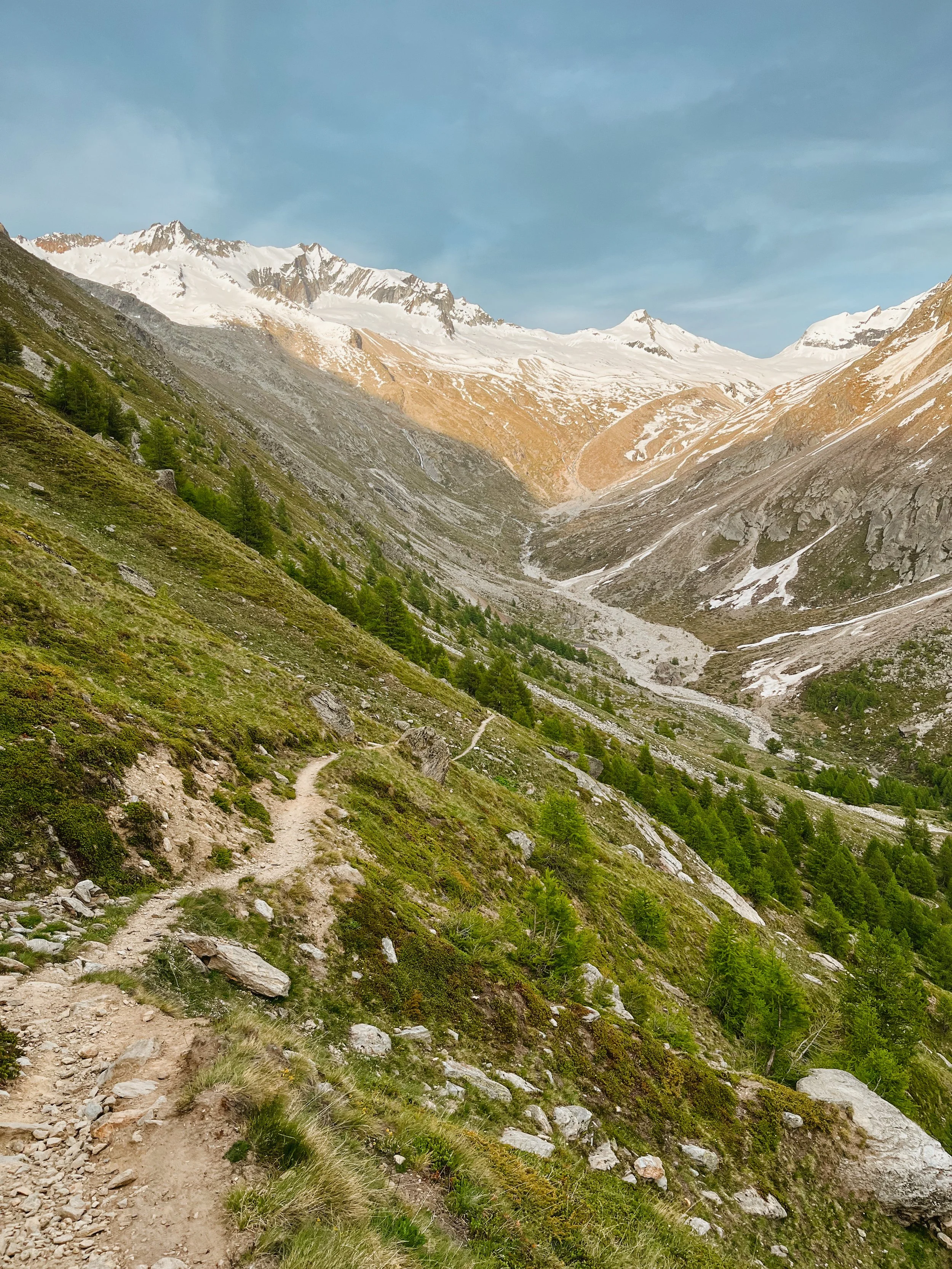 The descent takes us along a different path under waterfalls, past glacial moraines, and back into the valley. It’s a real alpine adventure, with everything from flowers and cows to roaring water and ice.